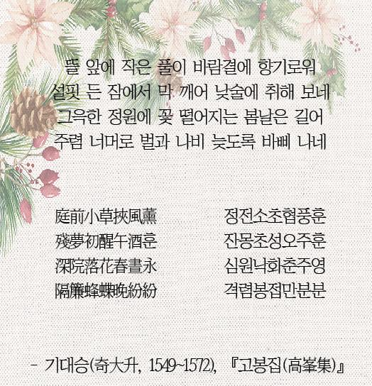 À§ ½Ã´Â ¾î·Á¿î ±ÛÀÚ³ª °í»ç¸¦ »ç¿ëÇÏÁö ¾Ê¾Ò´Ù. »ý°¢À̳ª ȸÆ÷¸¦ Á÷Á¢ÀûÀ¸·Î ¼¼úÇÑ ºÎºÐµµ ¾ø´Ù. ¾î´À º½³¯ ¼úÀ» ÇÑÀÜ ¸Ô°í º½ÀÇ Á¤Ã븦 Áñ±â´Â ½ÃÀÎÀÇ ¸ð½À°ú ½ÃÀÎÀÌ º» º½ÀÇ Ç³°æÀ» ÀÖ´Â ±×´ë·Î ¼¼úÇÏ¿´´Ù. °ø±³·Î¿î ¹¦»ç¸¦ °¡ÇÏÁö ¾Ê¾Æµµ ½ÃÀÇ »óȲÀÌ ÀÚ¿¬½º·¹ ±×·ÁÁö¸ç ¿©À¯·Ó°í ÇÑÀûÇÑ º½³¯ÀÇ Á¤Ãë¿Í º½ÀÇ »ýµ¿À» ´À²¸ º¼ ¼ö ÀÖ´Ù. ³ª¾Æ°¡ º½ÀÇ Àڱ׸¶ÇÑ »ýµ¿À» Æ÷ÂøÇϰí À̸¦ ¿Ï»óÇÏ´Â ½ÃÀÎÀÇ ¼Ò¹ÚÇÑ ¼ºÇ° ¿ª½Ã ¿³º¼ ¼ö ÀÖ´Ù.