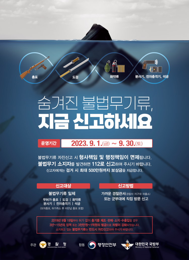 ºÒ¹ý¹«±â·ù¸¦ ¼ÒÁöÇϰí Àְųª ºÒ¹ý¹«±â ¹Ð°Å·¡ Á¶Á÷, ºÒ¹ý¹«±â ¼ÒÁöÀÚ ½Å°í ½Ã¿¡´Â ÃÖ´ë 500¸¸¿øÀÇ °Ë°Åº¸»ó±ÝÀ» Áö±ÞÇÒ ¹æÄ§ÀÌ´Ù. ¶ÇÇÑ ¿µ¾Ï°æÂû¼ °ü°èÀÚ´Â ¡°ÀÚÁø½Å°í ±â°£ Á¾·á ÈÄ 10¿ù ÇÑ ´Þ µ¿¾È Àü±¹ÀûÀ¸·Î ºÒ¹ý¹«±â·ù ÁýÁߴܼÓÀÌ ½Ç½Ã µÉ ¿¹Á¤À¸·Î ¼ÒÁöÇϰí ÀÖ´Â ºÒ¹ý¹«±â·ù´Â ¹Ýµå½Ã ÀÚÁø½Å°í ¹× ÁÖº¯¿¡¼ ºÒ¹ý¹«±â·ù¸¦ ¼ÒÁöÇÑ »ç¶÷ ¹ß°ßÇÒ °æ¿ì 112³ª °æÂû°ü¼¿¡ ½Å°í ´çºÎµå¸°´Ù¡± °í Çß´Ù.