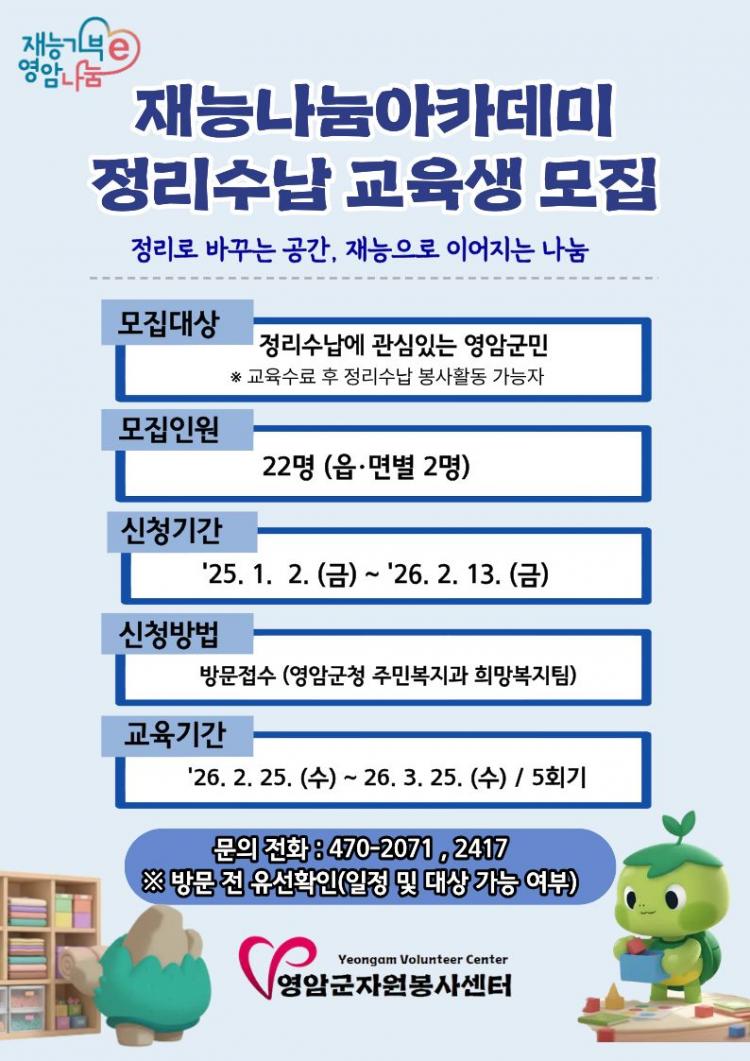 ¿µ¾Ï±ºÀº ±º¹ÎÀÇ Àç´É±âºÎ ¿ª·®À» °ÈÇϰí Áö¿ª»çȸ µ¹º½À» È®´ëÇϱâ À§ÇØ ¡®2026³â Àç´É³ª´® ¾ÆÄ«µ¥¹Ì(Á¤¸®¼ö³³ °úÁ¤)¡¯Âü¿©ÀÚ¸¦ ¸ðÁýÇÑ´Ù.