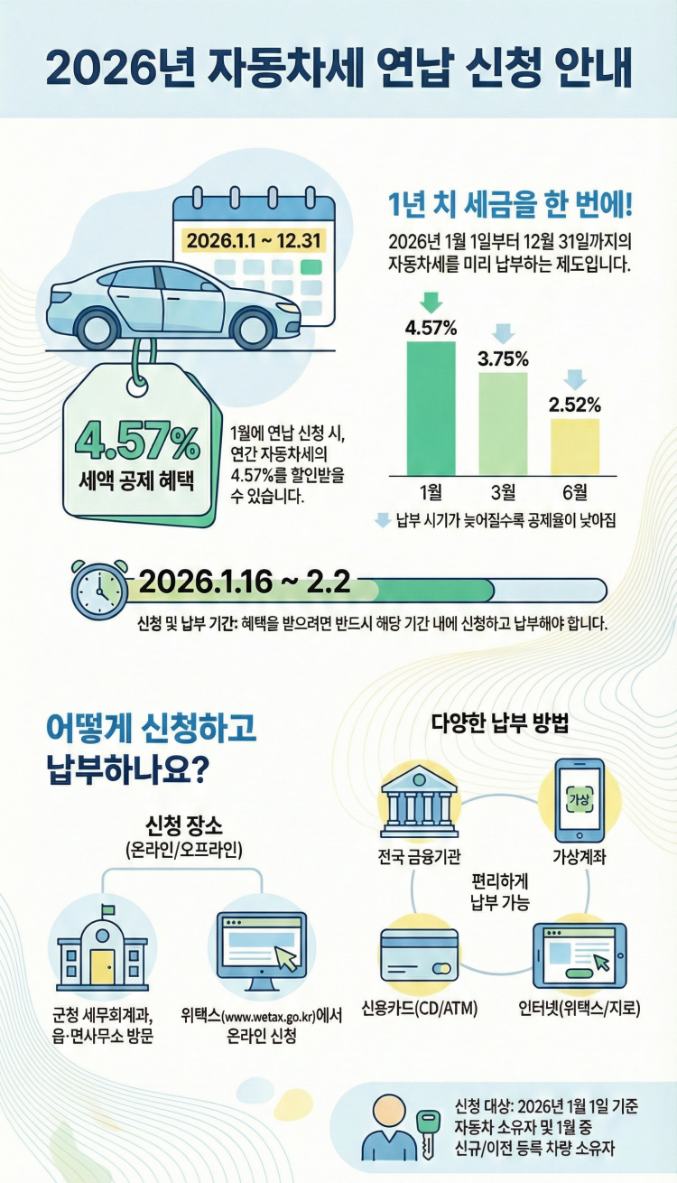 ¿µ¾Ï±ºÀÌ 13ÀÏ Àüü ½Â¿ëÂ÷ 2¸¸1,160´ë ¼ÒÀ¯ÀÚ¿¡°Ô 57¾ï ±Ô¸ðÀÇ ÀÚµ¿Â÷¼¼ ¿¬³³ °íÁö¼¸¦ Àϰý ¹ß¼ÛÇϰí, ´ÙÀ½´Þ 2ÀϱîÁö ¿¬³³À¸·Î 5% °¡±îÀÌ ¼¼¾× °øÁ¦ ÇýÅÃÀ» ¹ÞÀ» °ÍÀ» ´çºÎÇß´Ù.