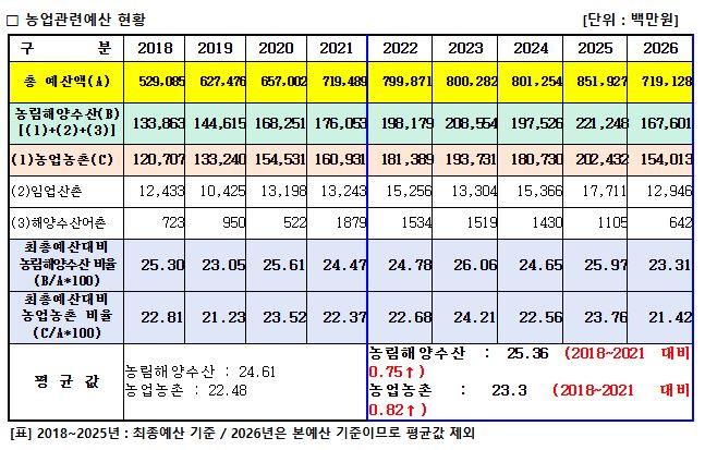 £² ¿µ¾Ï±ºÀº ³ó¾÷º¸Á¶±ÝÀ» ÇöÀå ÀÇ°ß ¼ö·Å ¾øÀÌ ÀϹæÀûÀ¸·Î Æò°¡¡¤»è°¨ÇÏ¿´°í, ³ó¾÷ ¿¹»ê ºñÁßµµ 2023³â 25% À̻󿡼 2024³â 24%, 2026³â 23%´ë·Î Áö¼Ó Ç϶ôÇØ ³ó¾÷ Ȧ´ë¡¤³ó¹Î ¹«½Ã Á¤Ã¥À̶ó´Â ÁÖÀå