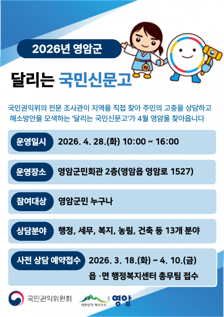 À̹ø ±¹¹Î½Å¹®°í´Â 4¿ù 28ÀÏ ¿ÀÀü 10½ÃºÎÅÍ ¿ÀÈÄ 4½Ã±îÁö ¿µ¾Ï±º¹Îȸ°ü¿¡¼ ¿¸°´Ù. ±¹¹Î±ÇÀÍÀ§¿øÈ¸ Àü¹® Á¶»ç°üÀÌ Á÷Á¢ ÇöÀåÀ» ã¾Æ ÇàÁ¤¡¤º¹Áö»Ó ¾Æ´Ï¶ó »ýȰ¹ý·ü, ¼¹Î±ÝÀ¶, ¼ÒºñÀÚ ÇÇÇØ±¸Á¦ µî ´Ù¾çÇÑ ºÐ¾ßÀÇ ¹Î¿øÀ» »ó´ãÇÑ´Ù.