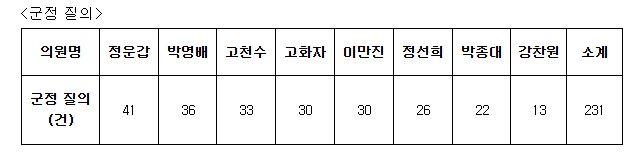 ±ºÁ¤ ÁúÀÇ¿¡ À־ ¿µ¾Ï±ºÀÇȸ ÀÇ¿ø 8¸í Àü¿øÀÌ º»È¸ÀÇ¿¡¼ 231°ÇÀÇ ±ºÁ¤ ÁúÀǸ¦ ÆîÃÆ´Âµ¥ Á¤¿î°© ÀÇ¿øÀÌ 41°ÇÀ¸·Î °¡Àå ¸¹Àº ÁúÀǸ¦ ÇÏ¿´°í ±× µÚ¸¦ ÀÌ¾î ¹Ú¿µ¹è ÀÇ¿ø 36°Ç, °íõ¼ö ÀÇ¿øÀÌ 33°ÇÀÇ ÁúÀǸ¦ ÇÑ °ÍÀ¸·Î Á¶»çµÇ¾ú´Ù, ±ºÁ¤ ÁúÀÇ´Â Áö¹æÀÇȸ ÀÇ¿øÀÌ ±º¼ö³ª ÁýÇàºÎ¸¦ »ó´ë·Î ±ºÁ¤ Àü¹Ý¿¡ ´ëÇØ ÀڷḦ ¿ä±¸Çϰí Á¤Ã¥ ¿î¿ë¿¡ ´ëÇÑ ¹®Á¦Á¡ ÁöÀû°ú ´ë¾ÈÀ» Á¦½ÃÇÏ´Â Áö¹æÀÇȸ Ȱµ¿ÀÇ ²ÉÀ̶ó ÇÒ ¼ö ÀÖ´Â Áß¿äÇÑ °¨½Ã °ßÁ¦ ±â´ÉÀÓ¿¡µµ ÁúÀdz»¿ëÀÌ ´ÜÆíÀûÀÎ ¹®Á¦Á¡¸¸ ³ª¿Çϰųª Áö¿ª±¸ ¹Î¿ø ÇØ°á¿¡ Ä¡ÁßÇÏ´Â ¼ÒÁö¿ªÁÖÀÇ ¸ð½ÀÀ» º¸¿© ¾Æ½¬¿ü´Ù°í Æò°¡ÇÏ¸é¼ º¸´Ù ´õ °Å½ÃÀûÀÎ Â÷¿ø¿¡¼ Áö¿ªÀÇ Çö¾È¿¡ ´ëÇÑ ½ÉÃþ Á¶»ç ºÐ¼®À» ÅëÇØ ±ºÁ¤ ¿î¿µÀÇ ¹®Á¦Á¡À» µµÃâÇÏ°í ´ë¾ÈÀ» Á¦½ÃÇÏ´Â ¼öÁØ ³ôÀº ÀÇÁ¤È°µ¿ÀÌ ¿ä±¸µÈ´Ù°í Æò°¡Çß´Ù.