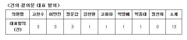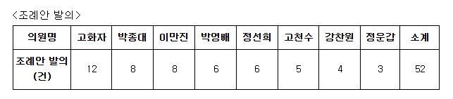 Á¶·Ê¾ÈÀº 52°ÇÀÌ ¹ßÀǵǾú´Âµ¥ °íÈÀÚ ÀÇ¿øÀÌ 12°ÇÀ¸·Î °¡Àå ¸¹Àº Á¶·Ê¾ÈÀ» ¹ßÀÇÇÏ¿´°í ±× µÚ¸¦ À̾î À̸¸Áø ÀÇ¿ø°ú Á¤¿î°© ÀÇ¿øÀÌ 8°ÇÀÇ Á¶·Ê¾ÈÀ» ¹ßÀÇÇÏ¿´´Ù°í ¹àÇû´Ù. Á¶·Ê¾È ¹ßÀÇ´Â Áö¹æÀÇȸÀÇ Áß¿äÇÑ ÀÔ¹ý ±â´ÉÀ¸·Î¼ ÁֹεéÀÌ ÀÏ»ó»ýȰ¿¡¼ ´À³¢´Â ºÒÆíÇϰųª ºÒÇÕ¸®ÇÑ »çÇ×À» Á¦µµÀûÀ¸·Î ÇØ°áÇØ ÁÖ°í ÀçÁ¤Áö¿øÀÌ ÇÊ¿äÇÑ »çÇ׿¡ ´ëÇØ¼´Â Áö¿ø ±Ù°Å¸¦ ¸¶·ÃÇÏ¿© ¾ÈÁ¤ÀûÀÎ Áö¿ø¹æ¾ÈÀ» ¸¶·ÃÇÏ°í ¹ý·üÀÇ ¹üÀ§ ¾È¿¡¼ ÁֹεéÀÇ ±Ç¸®, Àǹ«¸¦ ±ÔÁ¤ÇÏ´Â ÀÇÁ¤È°µ¿À¸·Î Á¶·Ê¾ÈÀ» ¹ßÀÇÇϱâ À§Çؼ´Â ÇöÀå Ȱµ¿À» ÅëÇØ ÁֹεéÀÇ ´Ù¾çÇÑ ¿ä±¸¸¦ ¼ö·ÅÇÏ°í °ü·Ã ¹ý±Ô¿ÍÀÇ »óÃæ¼ºÀ» °ËÅäÇÏ´Â µî ½Éµµ ÀÖ´Â ¹ý·üÀû, ÇàÁ¤Àû ¿¬±¸¿Í ³ë·ÂÀÌ ÇÊ¿äÇÑ ÀÇÁ¤È°µ¿ÀÓ¿¡µµ ÀÇ¿øµéÀÌ ¹ßÀÇÇÑ Á¶·Ê¾ÈÀ» °ËÅäÇÑ °á°ú ÇöÀåÀÇ ¸ñ¼Ò¸®¸¦ ¹Ý¿µÇÏ¿© âÀÇÀûÀ¸·Î Á¦Á¤ÇÑ Á¶·Ê´Â ã¾Æº¸±â ¾î·Æ°í Ÿ ÀÚÄ¡´Üü Á¶·Ê¸¦ º£³¢°Å³ª Áß¾ÓºÎó¿¡¼ Å뺸ÇÑ ÀÚÄ¡´Üü Á¶·Ê ÁØÄ¢(¾È)À» ±×´ë·Î ¹ßÀÇÇϴ°¡ Çϸé ÁýÇàºÎ¿¡¼ ¹ßÀÇÇØ¾ß ÇÒ Á¶·Ê¸¦ Á¶·ÊÁ¦Á¤ ÀýÂ÷ÀÇ ¹øÀâÀ» ÇÇÇÏ·Á°í ÀÇȸ¿¡¼ ¹ßÀÇÇÏ´Â ¿ìȸ ÀÔ¹ý »ç·Êµµ ÀϺΠ¹ß°ßµÇ¾ú´Ù¸é¼ º¸´Ù ´õ ¿¬±¸ÇÏ°í °øºÎÇÏ´Â ÀÇÁ¤È°µ¿À» ÇØ¾ß ÇÑ´Ù°í ÁúŸÇß´Ù.