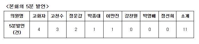 º»È¸ÀÇ 5ºÐ ¹ß¾ðÀº ÃÑ 11°ÇÀÌ ¹ßÇ¥µÇ¾ú´Âµ¥ °íÈÀÚ ÀÇ¿øÀÌ 4°ÇÀ¸·Î °¡Àå ¸¹ÀÌ ¹ß¾ðÇÏ¿´°í °íõ¼ö ÀÇ¿øÀÌ 3°ÇÀ» ¹ß¾ðÇÑ °ÍÀ¸·Î Á¶»çµÇ¾ú´Ù. 5ºÐ ¹ß¾ðÀº Áö¹æÀÇȸ¿¡¼ ÀÇ¿øÀÌ º»È¸ÀÇ¿¡¼ 5ºÐ À̳»ÀÇ ÂªÀº ½Ã°£¿¡ ÀÚÀ¯·Ó°Ô ¹ß¾ðÇÏ´Â Á¦µµ·Î¼ Áö¿ªÀÇ Çö¾È»ç¾È¿¡ ´ëÇØ ÀÚ½ÅÀÇ ¼Ò½Å°ú ÆÇ´ÜÀ» ¹àÈ÷°í Áö¿ªÁÖ¹ÎÀÇ ºÒÆíÇÑ »çÇ×À̳ª Á¤Ã¥ ¿ä±¸»çÇ×À» ÁýÇàºÎ¿¡ Àü´ÞÇÏ¿© °ø·ÐÈÀÇ ´ÜÃʸ¦ Á¦°øÇÒ »Ó¸¸ ¾Æ´Ï¶ó ÁֹεéÀÌ ÀڽŵéÀÇ Áö¿ª±¸ ÀÇ¿øµéÀÌ ¾î¶² ¹®Á¦¿¡ °ü½ÉÀ» µÎ°í Àִ°¡¸¦ ¾Ë ¼ö ÀÖ°Ô ÇÏ´Â ÀÇȸ¿¡ ´ëÇÑ ½Å·Ú, Åõ¸í¼ºÀ» ³ôÀÌ´Â ÀÇÁ¤È°µ¿À¸·Î ÀÇ¿øµéÀÌ Àû±Ø Ȱ¿ëÇÏ¿©¾ß ÇÔ¿¡µµ Àü¹Ý±â¿¡´Â 9°ÇÀÇ 5ºÐ ¹ß¾ðÀÌ ÀÖ¾úÀ¸³ª ÈĹݱ⿡´Â 2°Ç¿¡ ºÒ°úÇØ ¿ÀÈ÷·Á À§ÃàµÇ¾ú´Ù¸é¼ ÀÇ¿øµéÀÇ °ü½ÉÀÌ ¿ä±¸µÈ´Ù°í ¹àÇû´Ù.